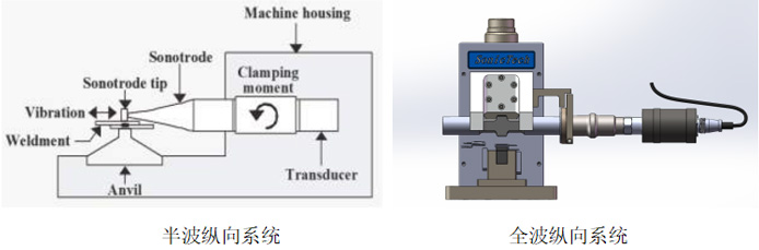 ③縱向振動系統。縱向振動系統是目前最主流的超聲波金屬焊接系統,生產的廠家最多。縱向振動系統按焊頭的結構,分為半波焊頭系統和全波焊頭系統。半波系統,由于側向加壓力容易引致焊頭翹曲,故超過7000W功率輸出時就較難應用了;全波焊頭系統,是因為大功率化及雙節點加大壓力而形成的系統,但縱向全波系統容易引起機械干涉,應用方便度不理想,人手操作危險性大,像德國schunk推出的LS-9KW線+端子焊機,就采用了機械手送線。