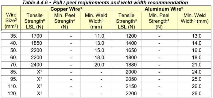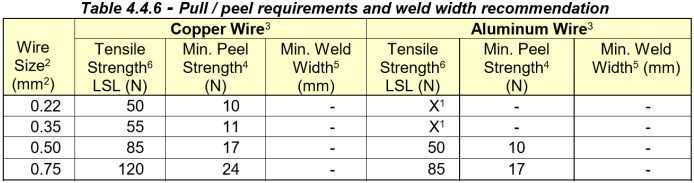 電池的正極材料為鋁,所以檢測線基本為銅線焊接到鋁片上,對于這樣的應用可以認為為鋁銅連接,拉力撕拉力應參照鋁線焊接,按USCAR38-1標準,0.22﹑0.35 mm2線的標準是缺失的。具體可以參照我司楚鑫sonictech的企業標準。